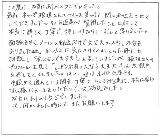 面談もなく、メールと郵送だけで大丈夫かと少し不安もありました。私以上に気にかけてくれていた母にも相談し、「会わないで大丈夫?」と言っていましたが、板垣さんのプロフィールを見て、「山形出身の人なら大丈夫!!」と太鼓判を押してくれました。はい、母は山形出身です。