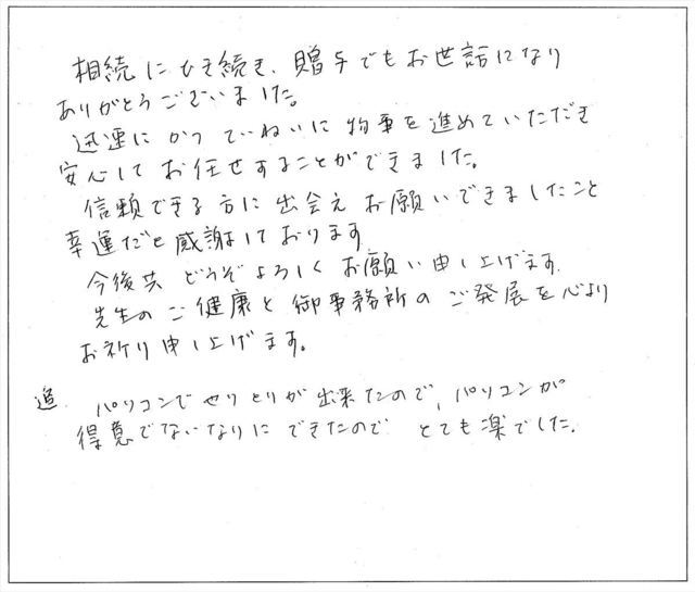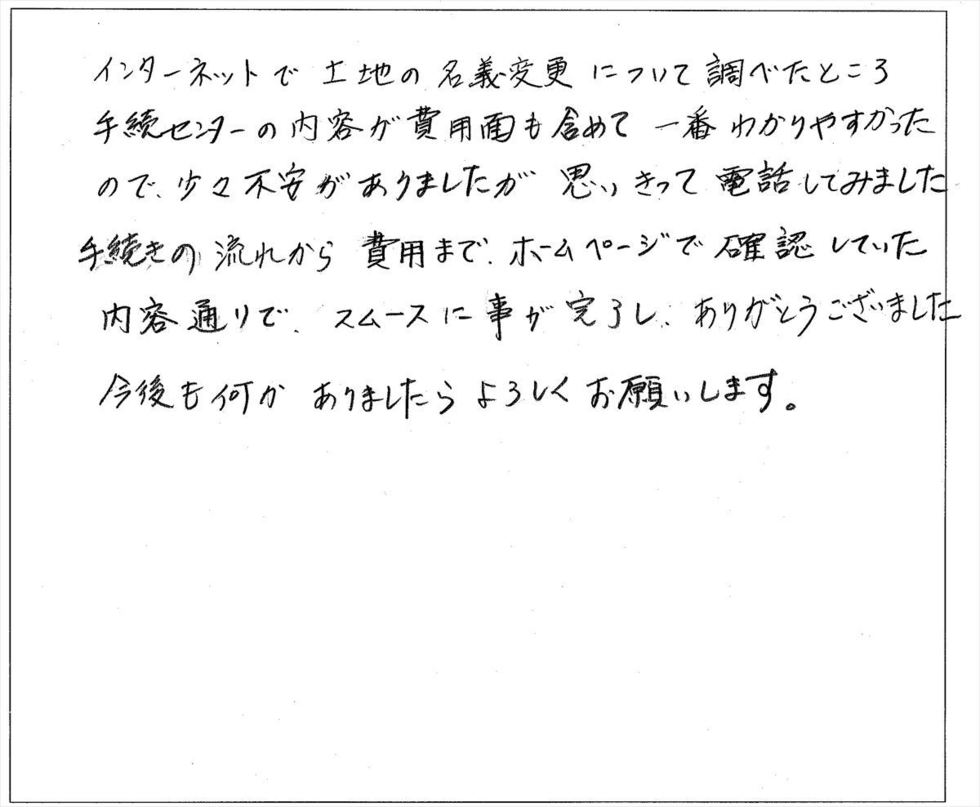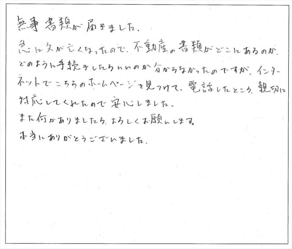 相続手続きの終った書類が手元に届き、本当にうれしくホッと致しました。お世話になりありがとうございました。どこに頼んだらよいのか、また費用がどの位かかるのかわからず、気になりながらずっとどうしてよいのかわからない状態でした。悩んだ末相談にした法務局の方がネットで捜してみるとよいと助言を下さり、先生の事務所に出会いました。ホームページでの説明がわかり易く費用も明確で信頼感が得られました。それでもお会いするまでは不安でしたが、お人柄にも信頼感が持て、安心してお任せすることができました。事務所の場所も便利で気持ちの良いところでした。お願いしてからはてきぱき進めて下さり、早く終わりありがたかったです。いただいたご助言も参考になりありがたく思っております。何かありましたら又是非ご相談したく思っております。ありがとうございました。