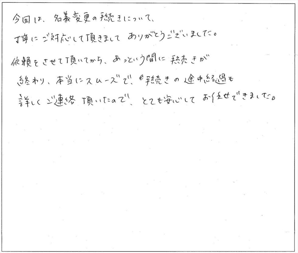 不動産の名義変更となると資産にかかわることですので慎重にすすめなくてはいけない大仕事だと気負っていましたが、とてもスムースで本当に助かりました。ありがとうございました。
