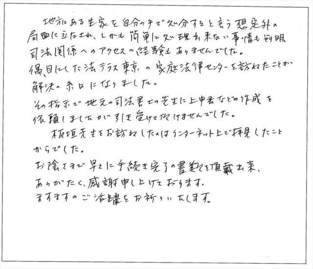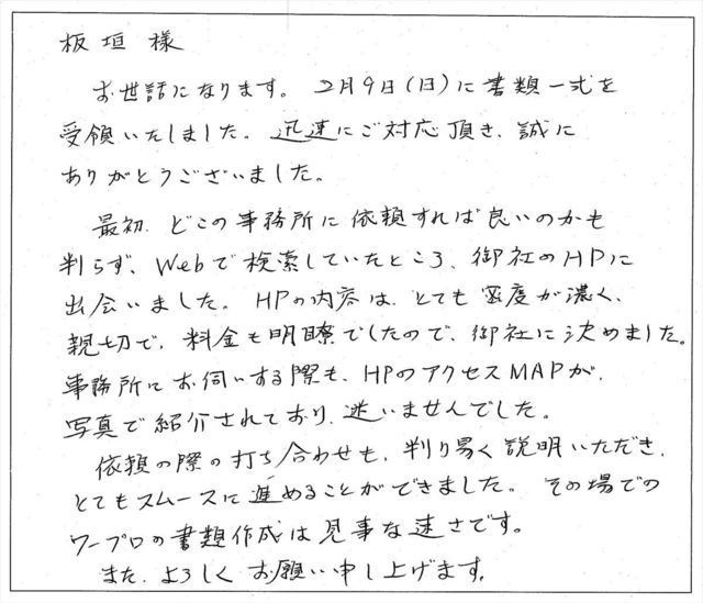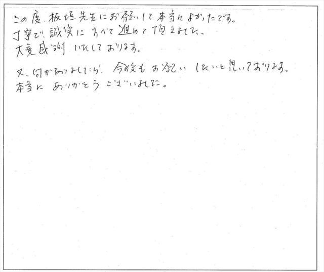 依頼するにあたり、当初は若干不安な面もありましたが、手続きが終わってみて、やはり板垣様にお願いして大変良かったと思っています。