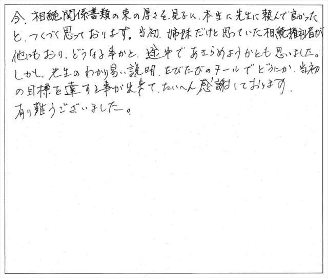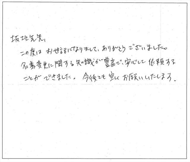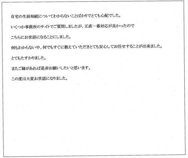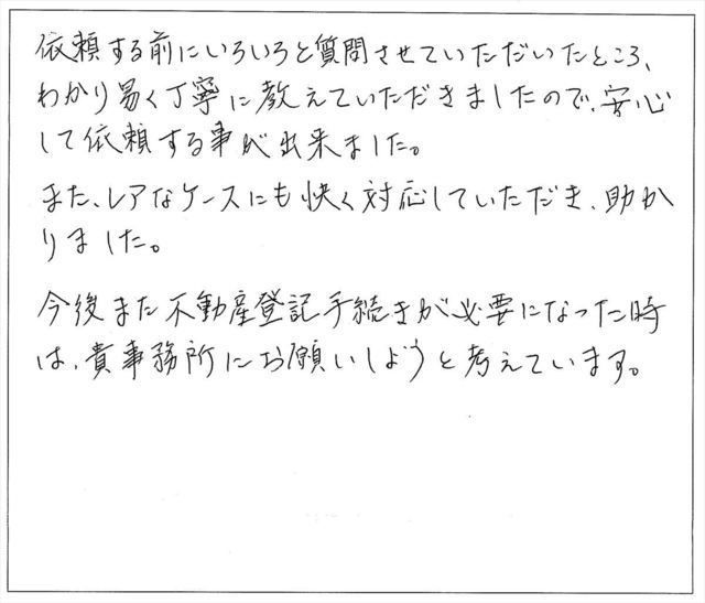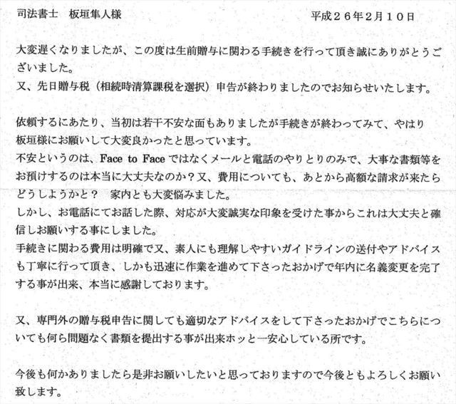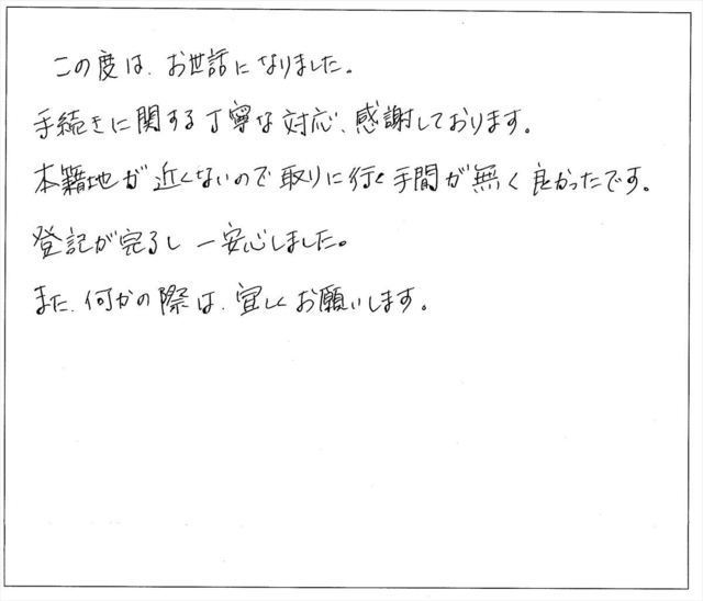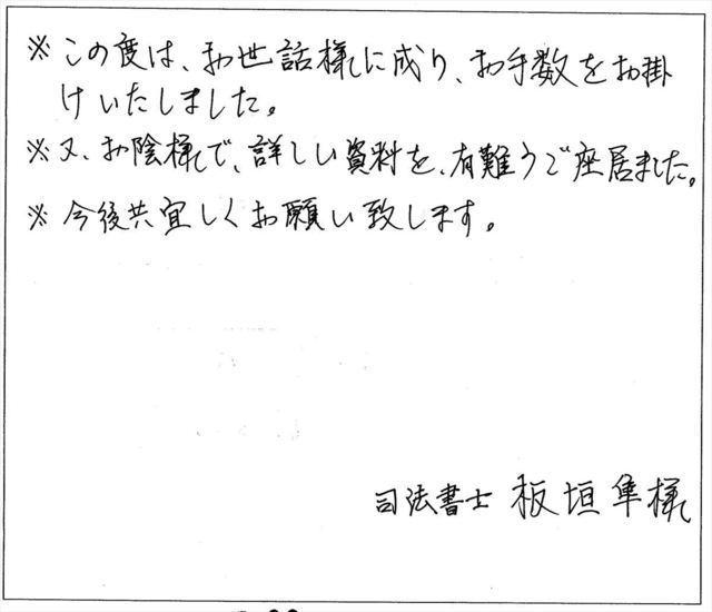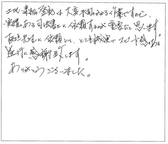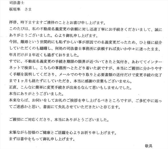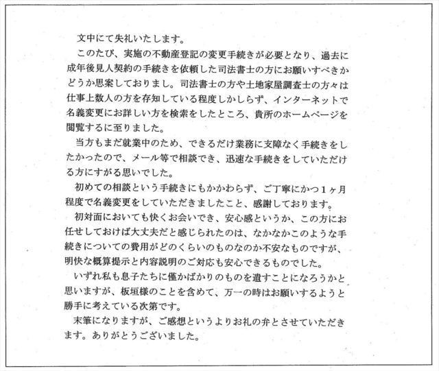 このたびは、私の不動産名義変更の依頼に対し迅速丁寧にお手続きくださいまして、誠にありがとうございました。心より御礼申し上げます。