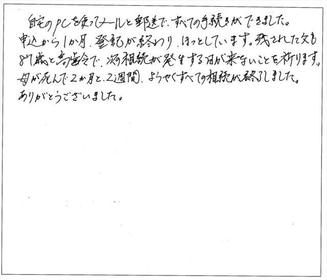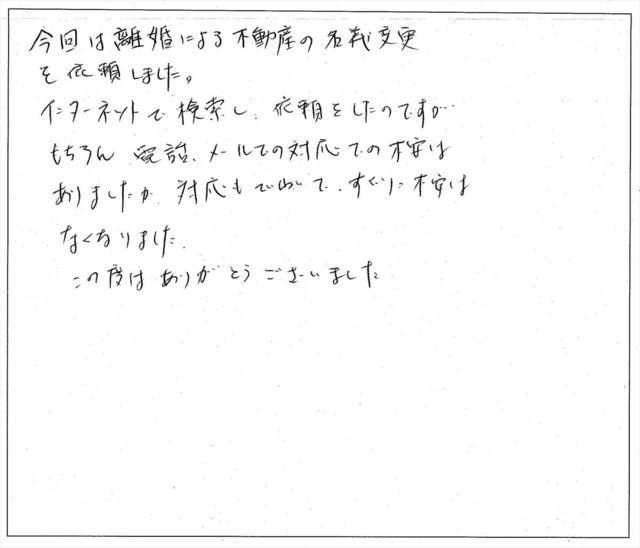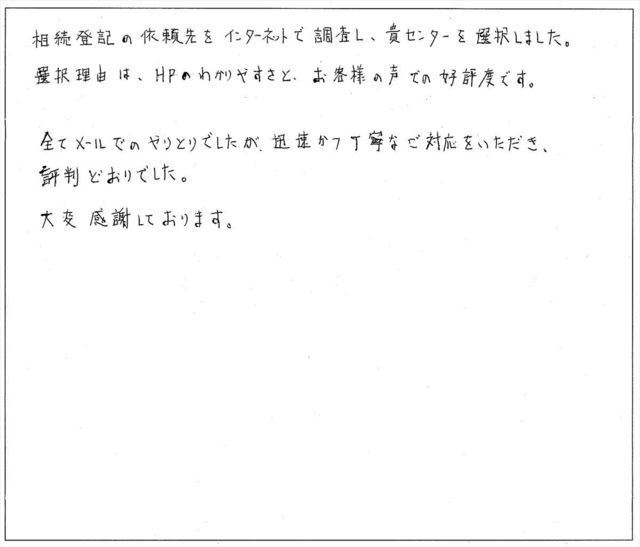すでに、不動産名義変更の手続き期限の限界が近づいてきたと気付き、あわててインターネットで検索し、こちらの事務所へとたどり着いた訳ですが、本当にご親切に分りやすく手順を説明してくださり、メールでのやり取りと必要書類の送付だけで変更手続きの完了まで1ヶ月も経たずにしていただき、本当に感謝の言葉もございません。