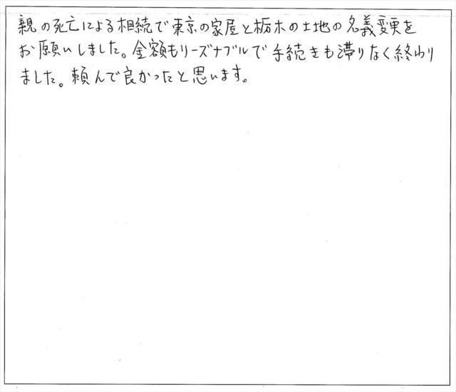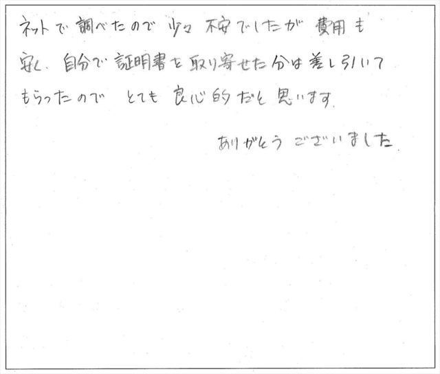 手続きに関わる費用は明確で又、素人にも理解しやすいガイドラインの送付やアドバイスも丁寧に行って頂き、しかも迅速に作業を進めて下さったおかげで年内に名義変更を完了することが出来、本当に感謝しております。