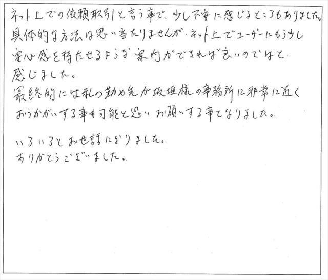 オンラインで全国どこの手続きもできるというサイトをお見かけしまして、遠方ではありましたが、依頼させていただきました。