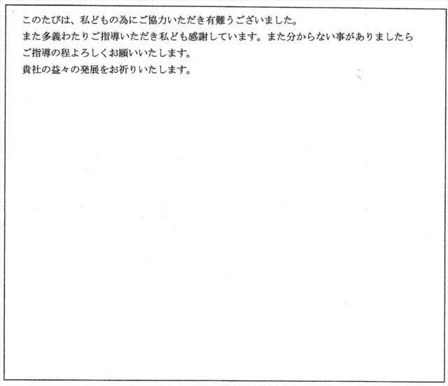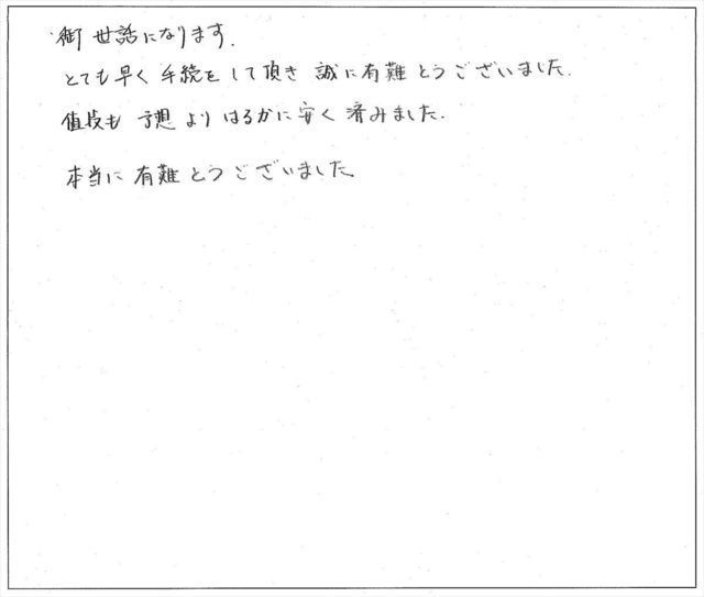 お陰さまで早々に手続き完了の書類を頂戴出来、ありがたく感謝申し上げております。