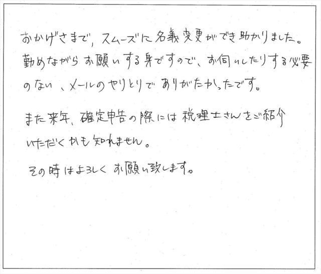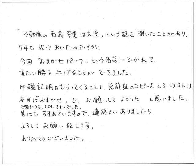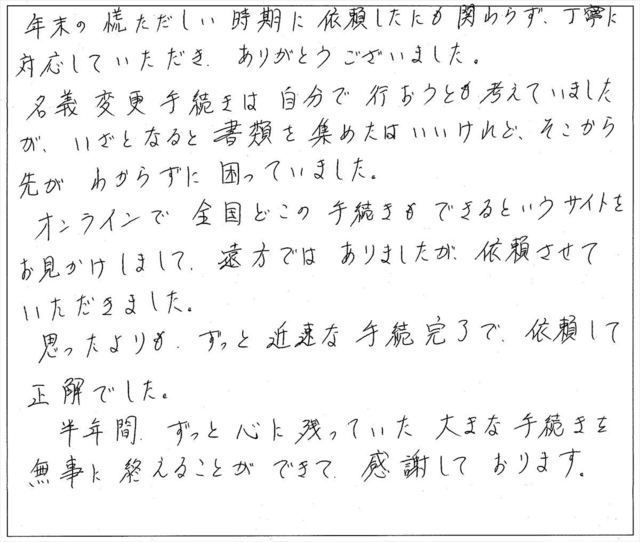 初めての相談という手続きにもかかわらず、ご丁寧にかつ1ヶ月程度で名義変更をしていただきましたこと、感謝しております。