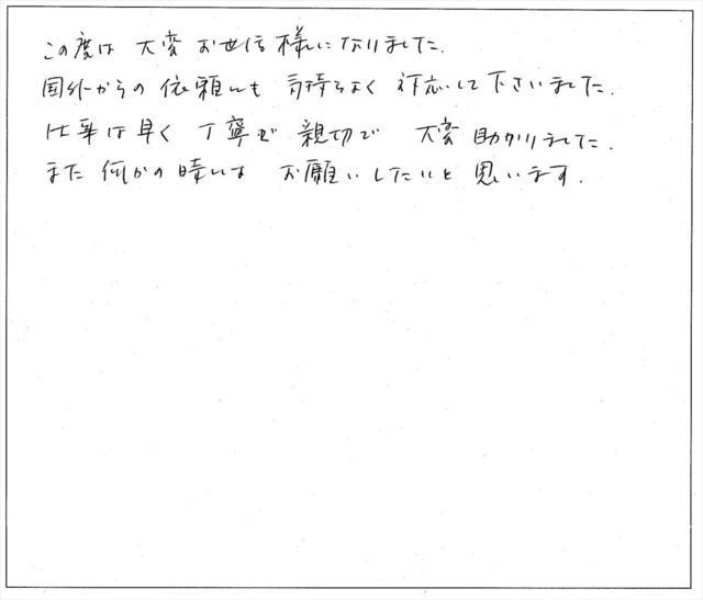 依頼の際の打合せも、判り易く説明いただき、とてもスムースに進めることができました。その場でのワープロの書類作成は見事な速さです。