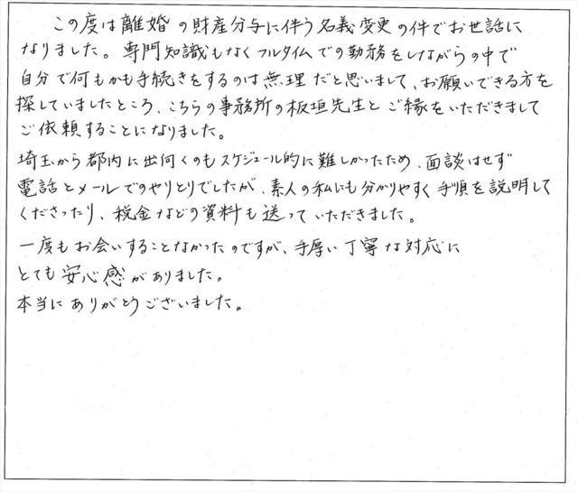 この度は離婚の財産分与に伴う名義変更の件でお世話になりました。専門知識もなくフルタイムでの勤務をしながらの中で自分で何もかも手続きをするのは無理だと思いまして、お願いできる方を探していましたところ、こちらの事務所の板垣先生とご縁を頂きましてご依頼することになりました。