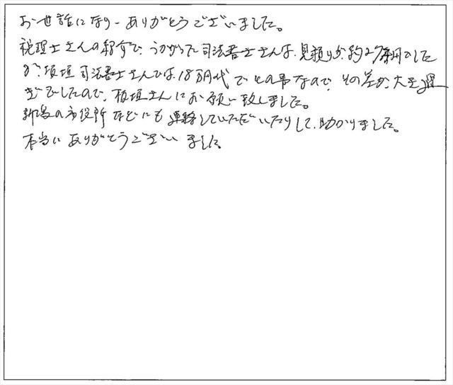兄のマンションの相続による名義変更でしたが、どこの司法書士さんにお願いすればいいか、家から近い司法書士事務所に出向かなければいけないなぁと、ネットで検索した時に、たまたま板垣事務所がヒットしました。とりあえず電話をして相談してみたところ、対応もていねいで、料金も安く感じたので、お願いすることにしました。必要書類も、銀行相続のために取寄せていた書類は送りましたが、不足分は事務所の方で手配してくれるというので、特に私が何かしないといけないという事がなく、スムーズに処理していただけました。