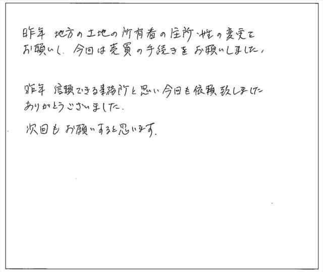 不動産の名義変更をするのが今回初めてで、どこの事務所にお願いすればよいのか、まったく見当がつきませんでした。