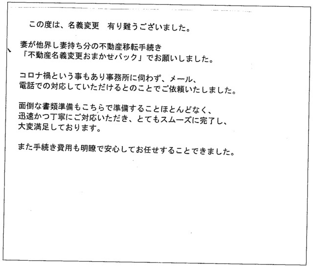 コロナ禍なので、対面しなくても対応してくださる所を探していました。ホームページの内容がとても分かりやすかった為、相談したところ、すぐに費用や必要な書類、今後の流れ等のご連絡がありましたので、信頼出来る事務所だと思い「遠方にある共有名義の名義変更」を依頼致しました。