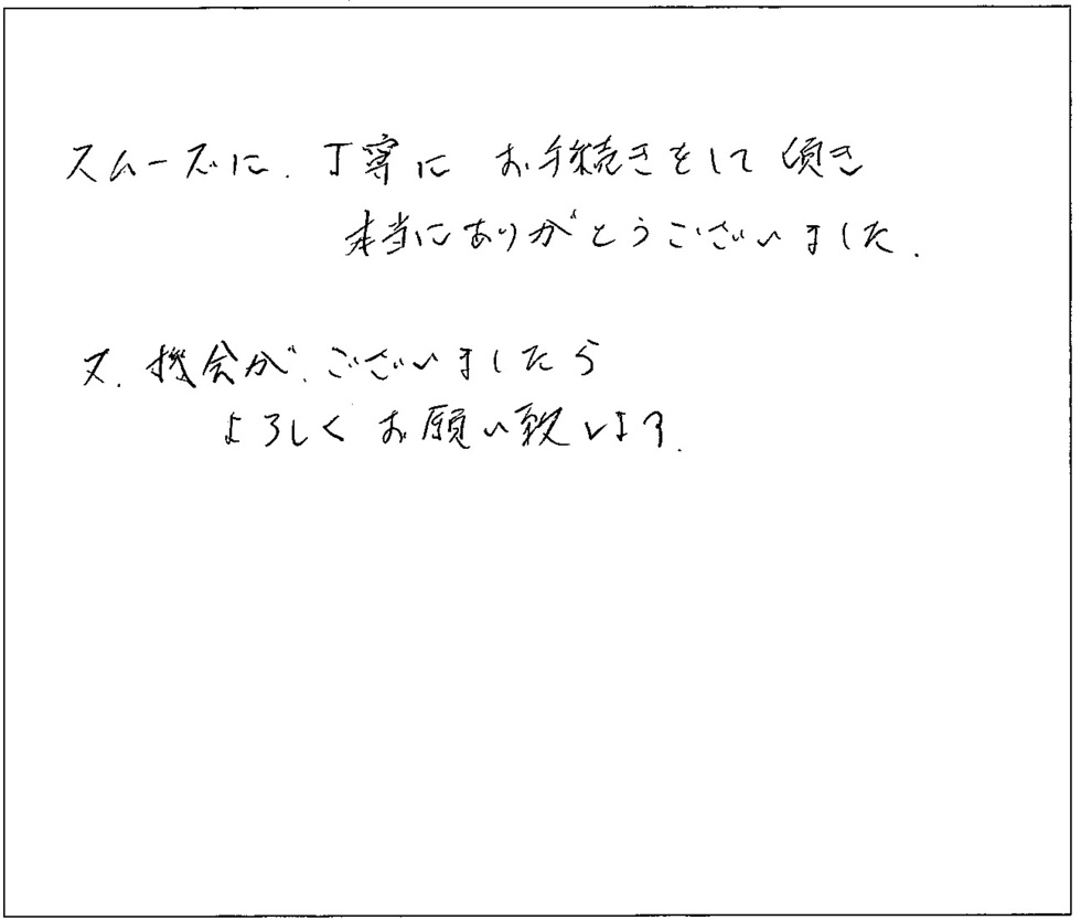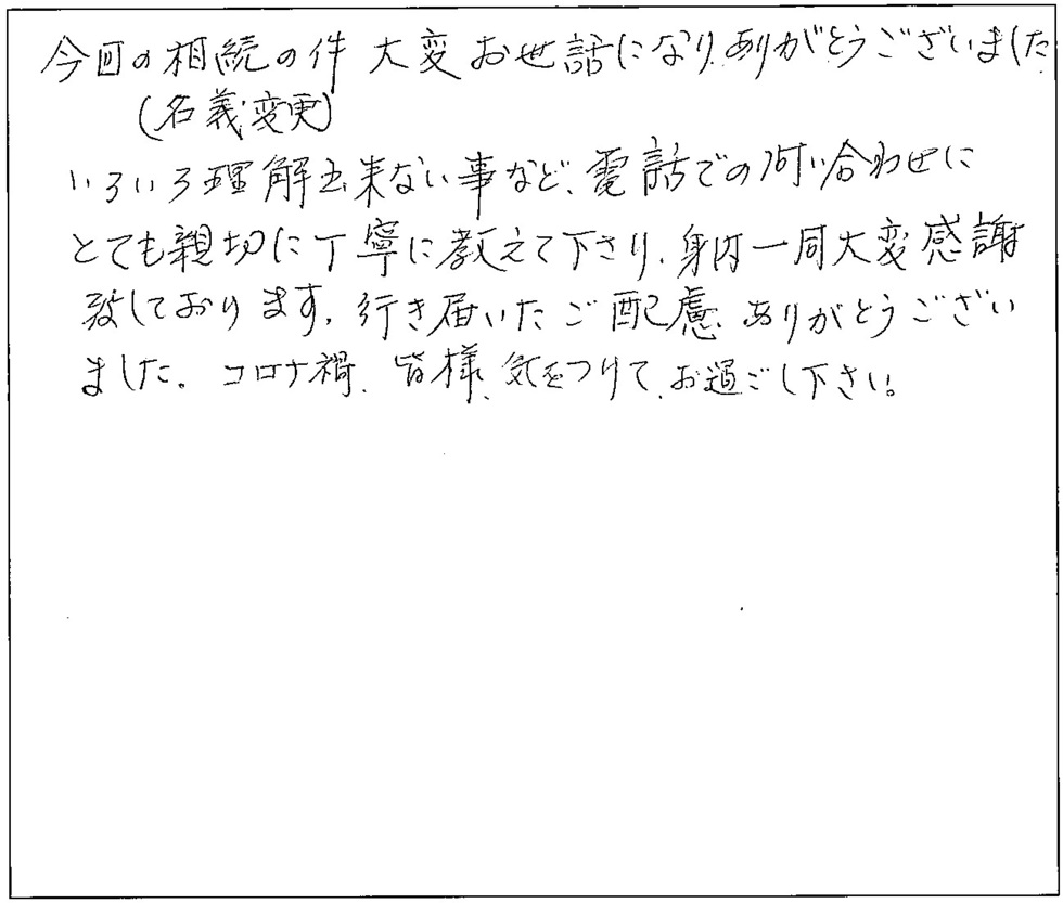 相続・贈与が絡む名義変更案件でしたが、私の方は指示通り記名押印そして返送するだけの作業でした。この様に何のトラブルもなく、スムーズに名義変更手続きが完了できた事に驚きです。これも的確なご指示があったからと感謝いたします。