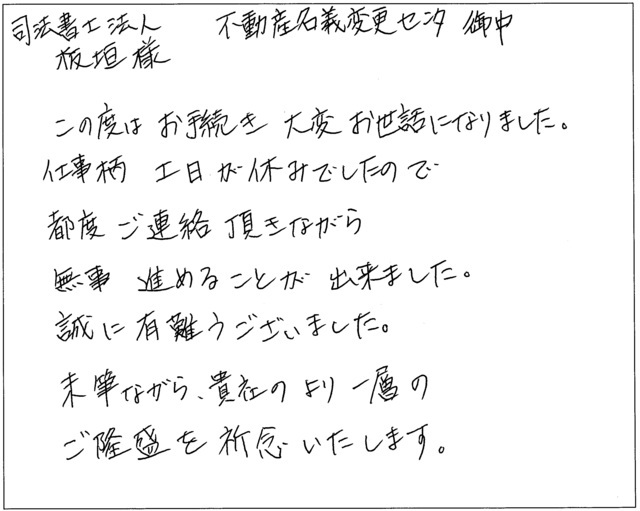 その後は迅速に対応していただき、事務所(御社)へ伺うことは一度もなく電話と郵送のみでトントン拍子に手続きは終わり、無事名義変更をすることができました。