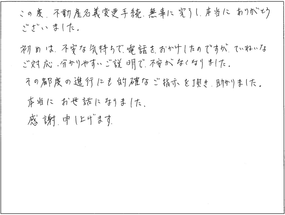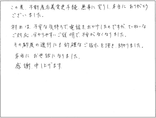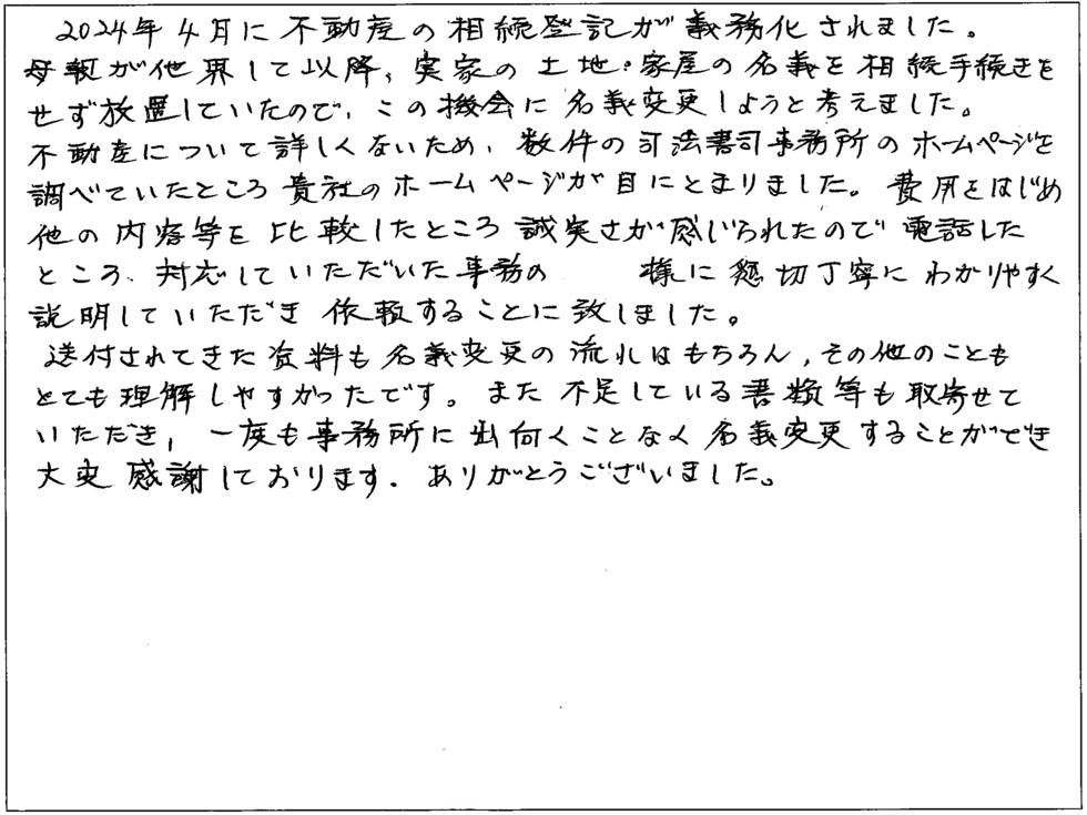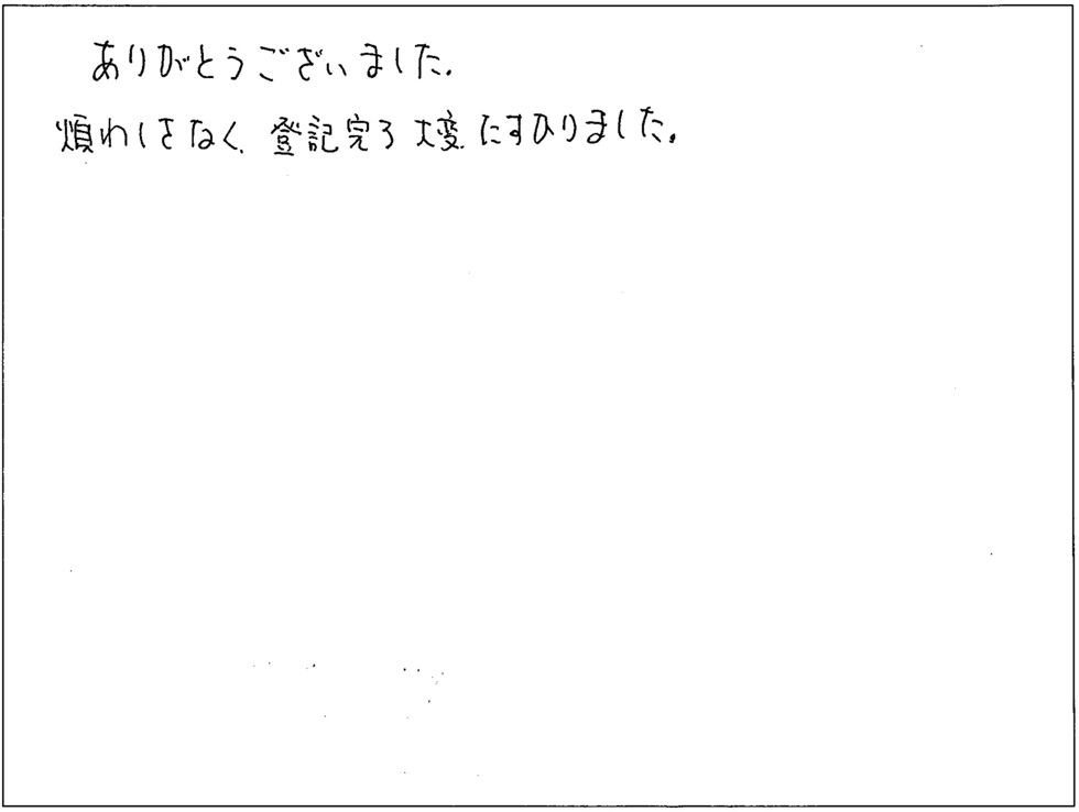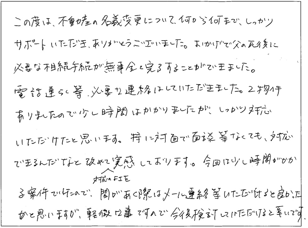 この度は、不動産の名義変更について、何から何まで、しっかりサポートいただき、ありがとうございました。おかげで父の死後に必要な相続手続が無事全て完了することができました。