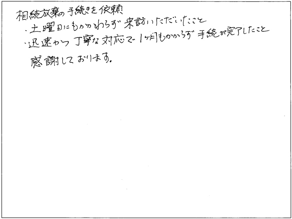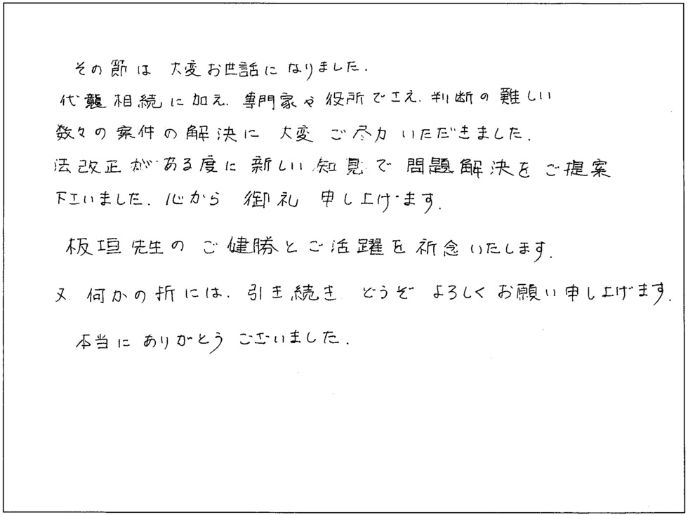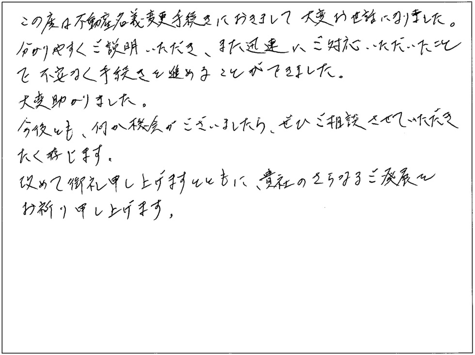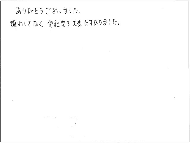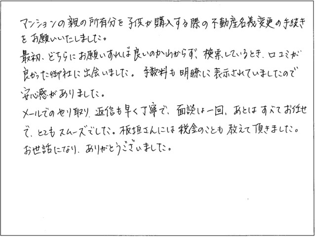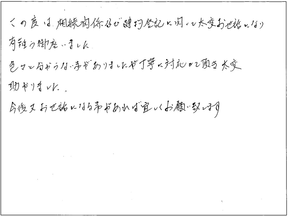 この度は、不動産の名義変更について、何から何まで、しっかりサポートいただき、ありがとうございました。おかげで父の死後に必要な相続手続が無事全て完了することができました。