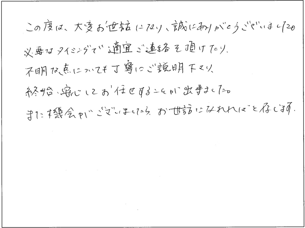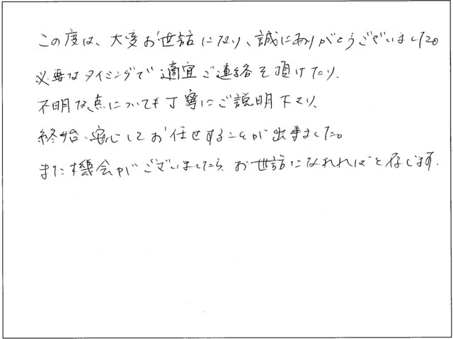 電話連絡等、必要な連絡はしていただきました。2物件ありましたので少し時間はかかりましたが、しっかり対応していただけたと思います。特に対面で面談等なくても、対応できるんだなと改めて対応のよさを実感しております。今回は少し時間がかかる案件でしたので、間があく際はメール連絡等いただけると良かったかと思いますが、軽微な事ですので、今後検討していただけると幸いです。