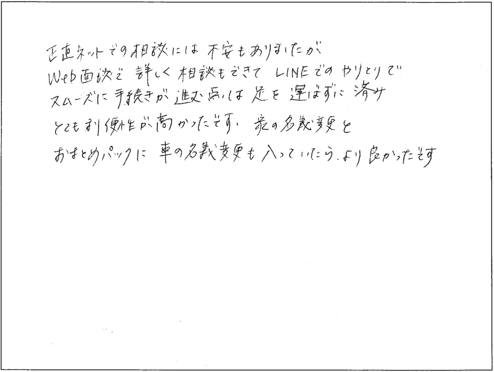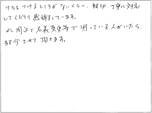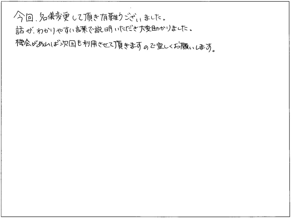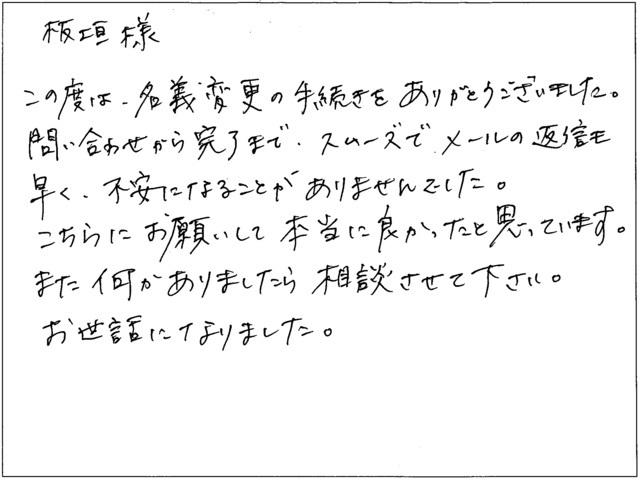 送付されてきた資料も名義変更の流れはもちろん、その他のこととても理解しやすかったです。また不足している書類等も取寄せていただき、一度も事務所に出向くことなく名義変更することができ大変感謝しております。ありがとうございました。